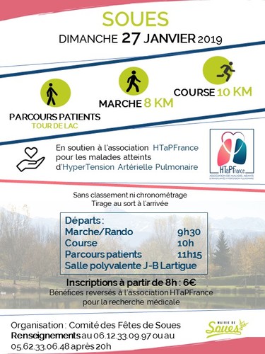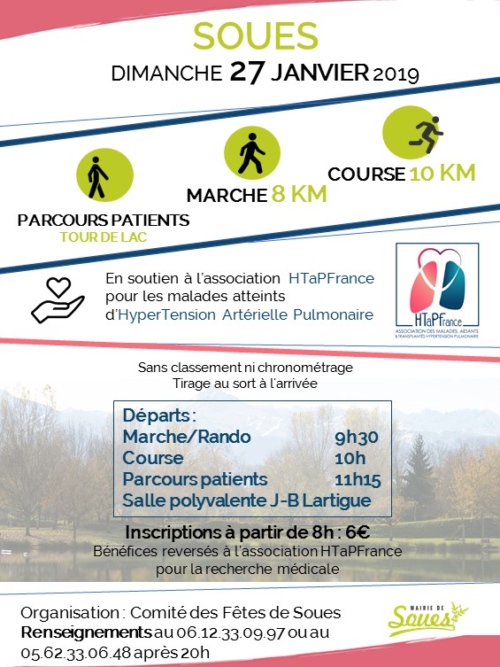 Le dimanche 27 janvier 2019, se déroulera une randonnée (course : 10km & marche : 8km) en soutien à l'association HTAPF (pour les malades atteints d'HyperTension Arterielles Pulmonaire) sur le CaminAdour, organisé par le comité des Fêtes de Soues.