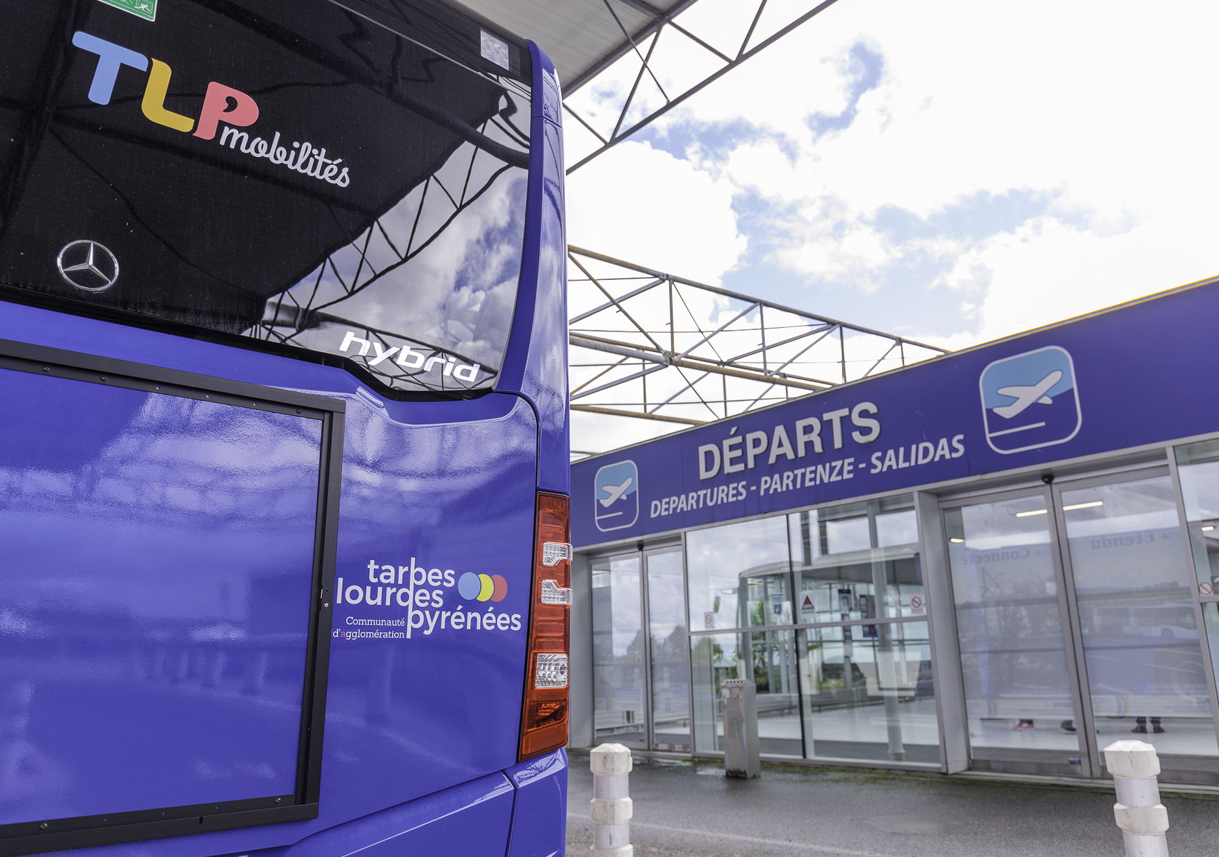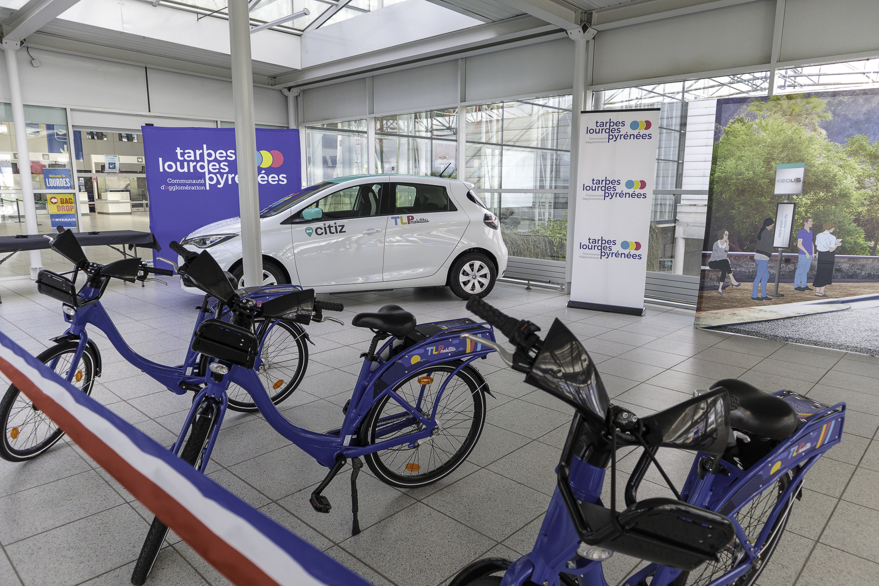 Bus hybrides, vélos électriques et voitures électriques en libre-service attendaient élus et journalistes conviés à l'aéroport Tarbes-Lourdes-Pyrénées à l'occasion de l'inauguration du nouveau réseau de transports en commun du territoire : TLP Mobilités.