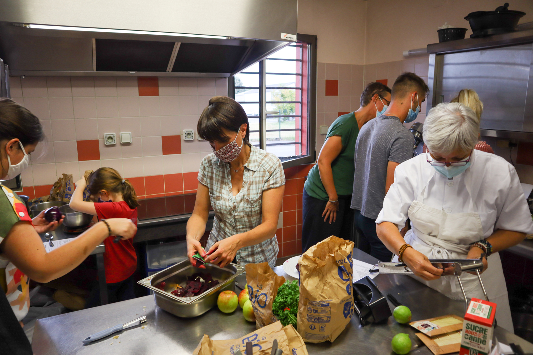 Au programme de cette soirée, salade de betteraves rouges, pommes et noisettes, sauce salade au sésame, steak végétal et légumes et tarte au citron meringuée. Animée par Dominique Vanhaverbeke dans les cuisines du restaurant associatif et solidaire FIL (Femmes Initiatives Laubadère) à Tarbes, les foyers se sont divisés en équipe pour réaliser ce menu qui s'est bien entendu terminé par un moment de convivialité autour de la dégustation.