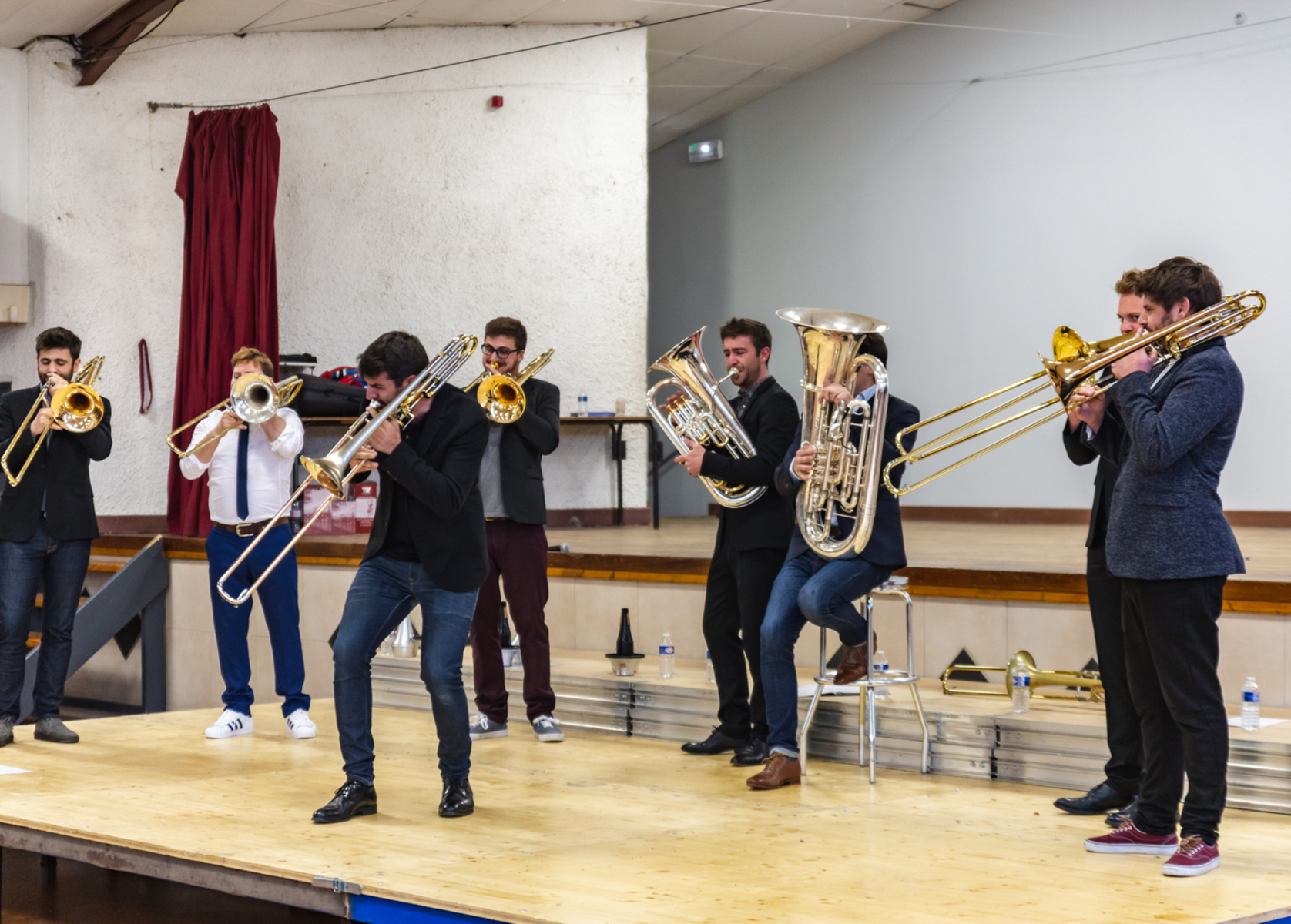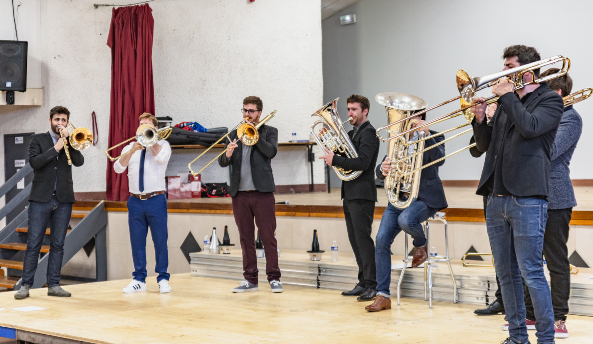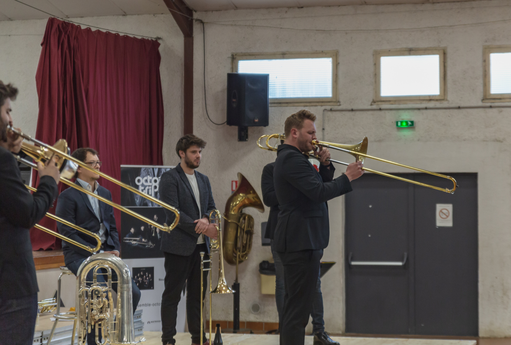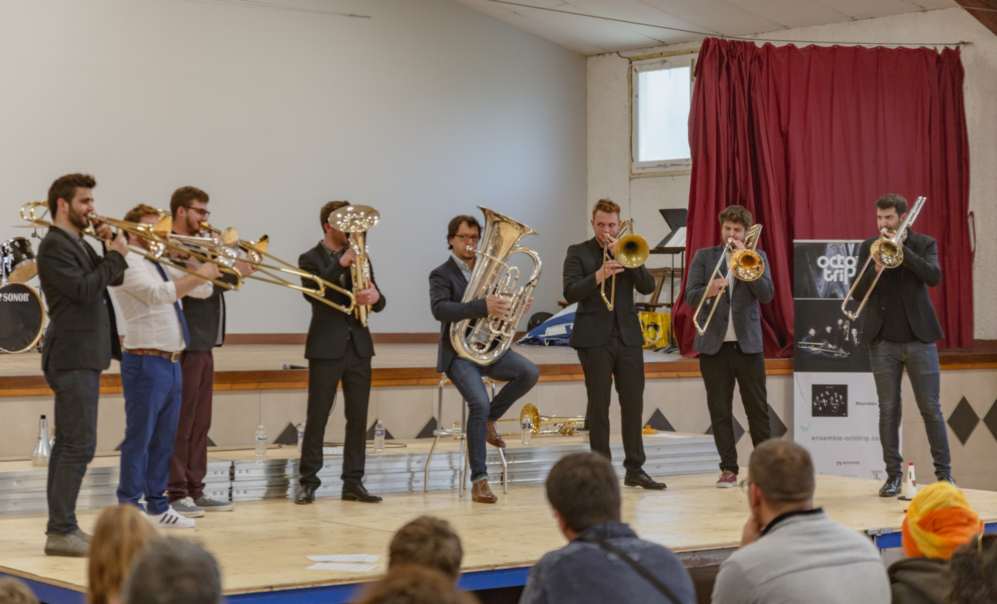 L’association Sud Ouest Trombone a organisé sa 8 ème édition à Orleix du 20 au 22 mai 2019. Pas moins de 60 trombonistes et 15 tubistes se sont réunis tout au long du weekend afin de répéter les morceaux concoctés par les professeurs en vue du concert de fin de stage. Un des moments forts de ce weekend fut le concert de l’ensemble Octotrip et d’Hélène Escriva. Octotrip est un ensemble de trombone et de tuba de 8 musiciens talentueux. Cet ensemble formé par une jeune génération d’interprètes défend un répertoire composé d’arrangements sur mesure et de compositions allant du classique au contemporain tout en passant par le jazz. Leur virtuosité, leur création et le mélange de leur sonorité ont émerveillé les stagiaires et le public venu en nombre. Le final commun entre Octotrip et les stagiaires montre bien que les trombones et les tubas sont bien plus qu’une famille.