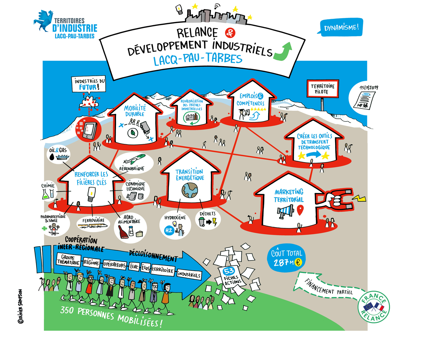 Retour en dessins sur la journée Territoire d'industrie Lacq-Pau-Tarbes du 24 février 2021, placée sous le signe du dynamisme collectif, du partenariat et de la relance économique.