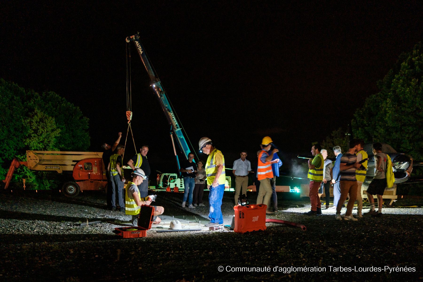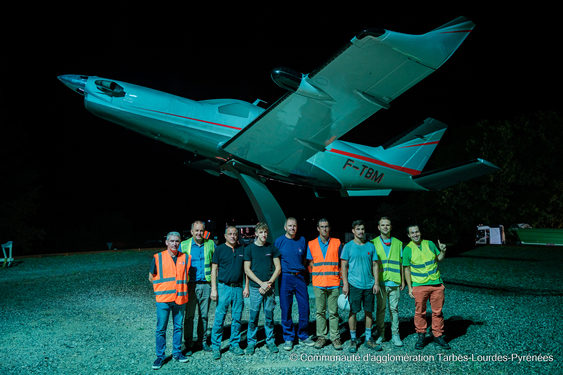 Hier soir, le Président de la Communauté d'agglomération Tarbes-Lourdes-Pyrénées, Gérard Trémège, est venu sur le chantier du giratoire A64 Tarbes Ouest pour assister à la pose de l'avion cédé par la société Daher. Il était accompagné de Denis Fegné, Vice-Président de la CATLP et Maire d'Ibos, et des représentants des sociétés partenaires au projet.