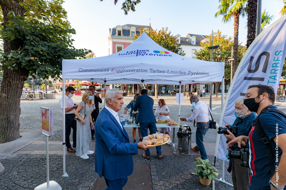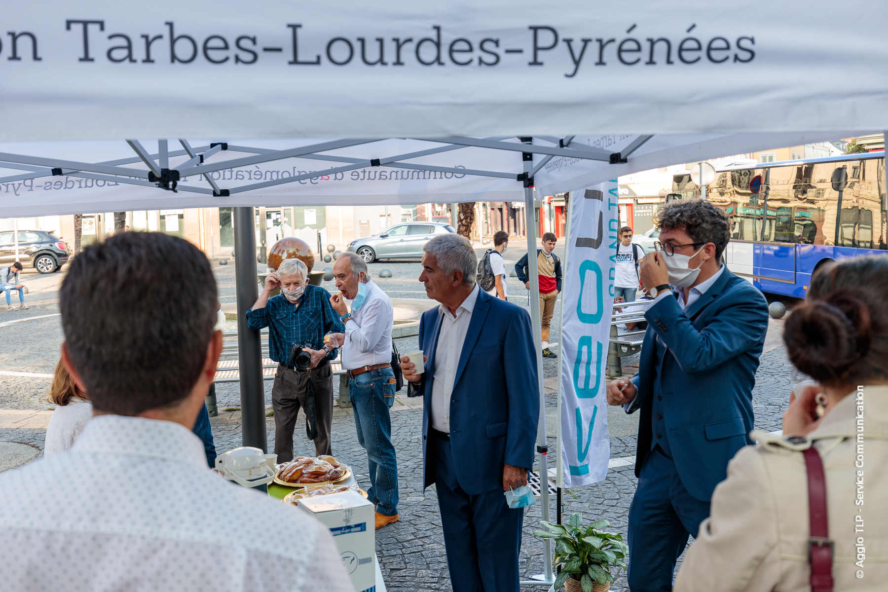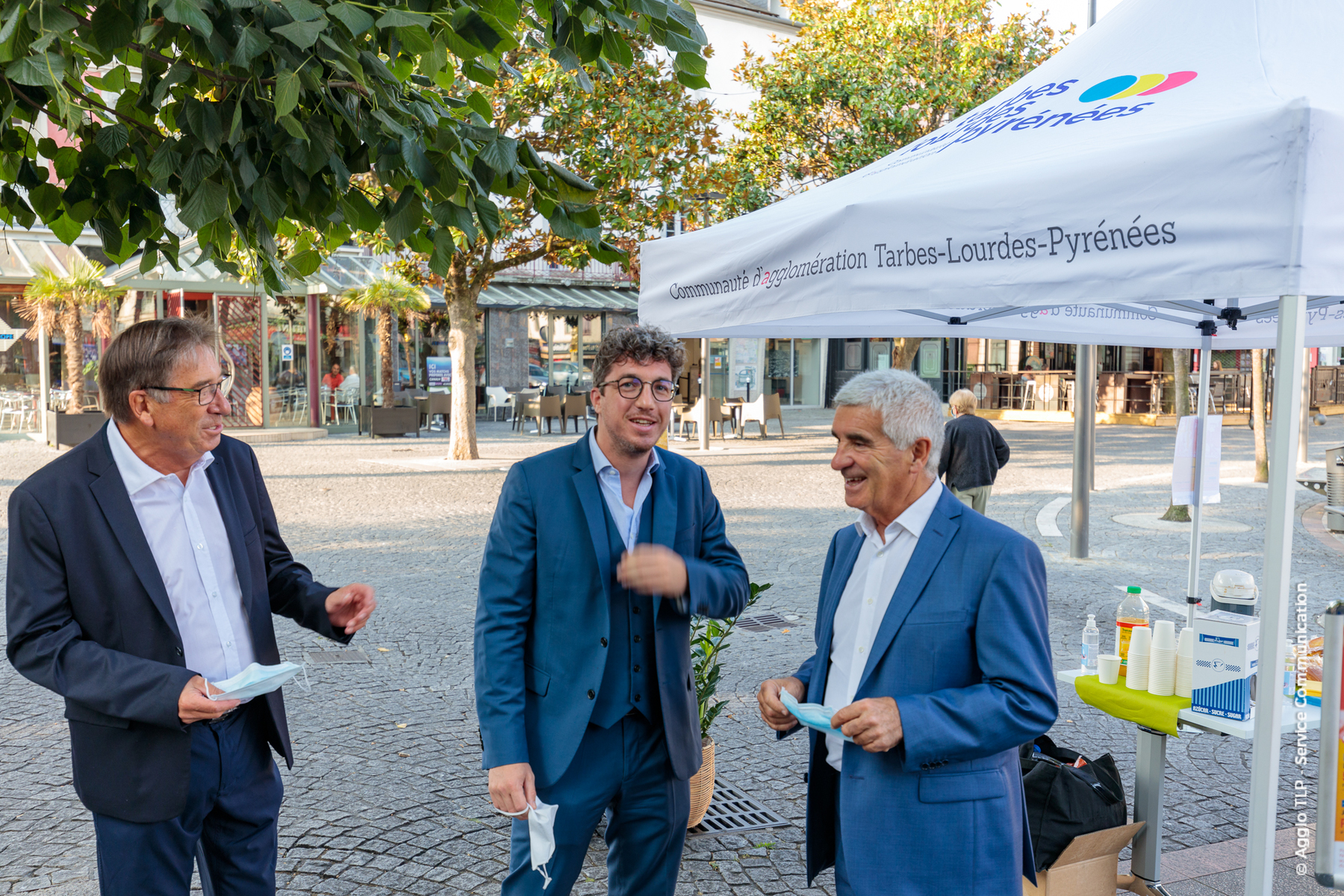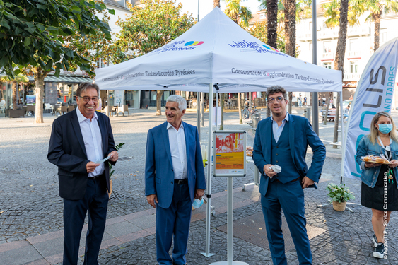 Le Président de la Communauté d'agglomération Tarbes-Lourdes-Pyrénées, Gérard Trémège, s'est prêté au jeu de la distribution de friandises sur la place Verdun, accompagné de Damien Dufour, Directeur de Keolis Grand Tarbes.