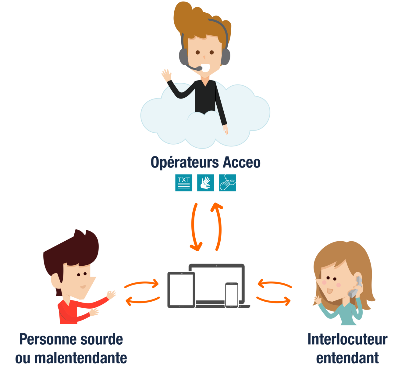 L'opérateur Acceo est en contact avec la plateforme téléphonique de la Communauté d'agglomération et/ou de l'une de ses communes et traduit aux personnes sourdes ou malentendantes, en LSF ou en texte, les propos de l'agent de la Communauté d'agglomération et/ou de l'une de ses communes